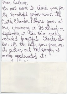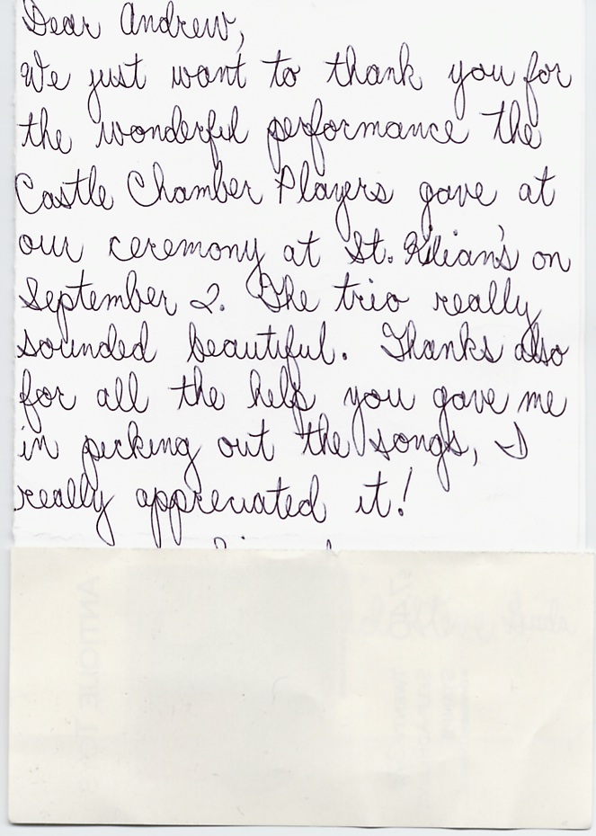 “We were so pleased with the Castle Chamber Players and thrilled that we chose them to play at our ceremony. Not only were they extremely professional throughout our planning and music selection, but they are fantastic musicians. They made a large church sound warm and inviting.”